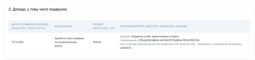 Заработная плата, полученная по основному месту работы, составила 764 435 гривен.