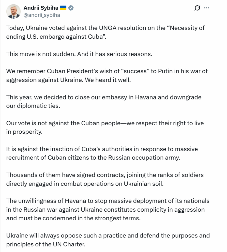 «Нежелание Гаваны остановить массовое привлечение своих граждан к войне России против Украины является соучастием в агрессии и должно быть осуждено самым решительным образом. Украина всегда будет выступать против такой практики и отстаивать цели и принципы Устава ООН», — подчеркнул Сибига.