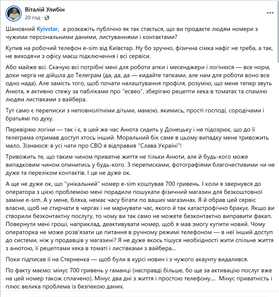 Стоимость eSIM составила 700 гривен, дополнительно были уплачены средства за активацию услуг. В итоге журналист заявляет о финансовых потерях, нескольких днях простоя рабочего телефона и риске утечки персональных данных постороннего лица.