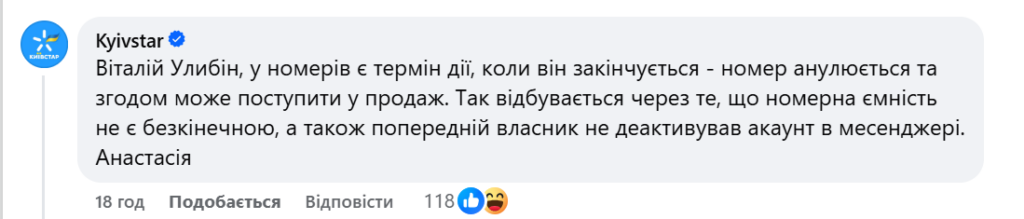 «Виталий Улыбин, у номеров есть срок действия, когда он заканчивается — номер аннулируется и впоследствии может поступить в продажу. Так происходит из-за того, что номерная емкость не бесконечна, а также предыдущий владелец не деактивировал аккаунт в мессенджере. Анастасия», — говорится в комментарии компании к сообщению журналиста.