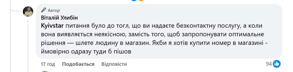 «Kyivstar вопрос был к тому, что вы предоставляете бесконтактную услугу, а когда она оказывается некачественной, вместо того, чтобы предложить оптимальное решение — шлете человека в магазин. Если бы я хотел купить номер в магазине — вероятно сразу туда бы пошел».