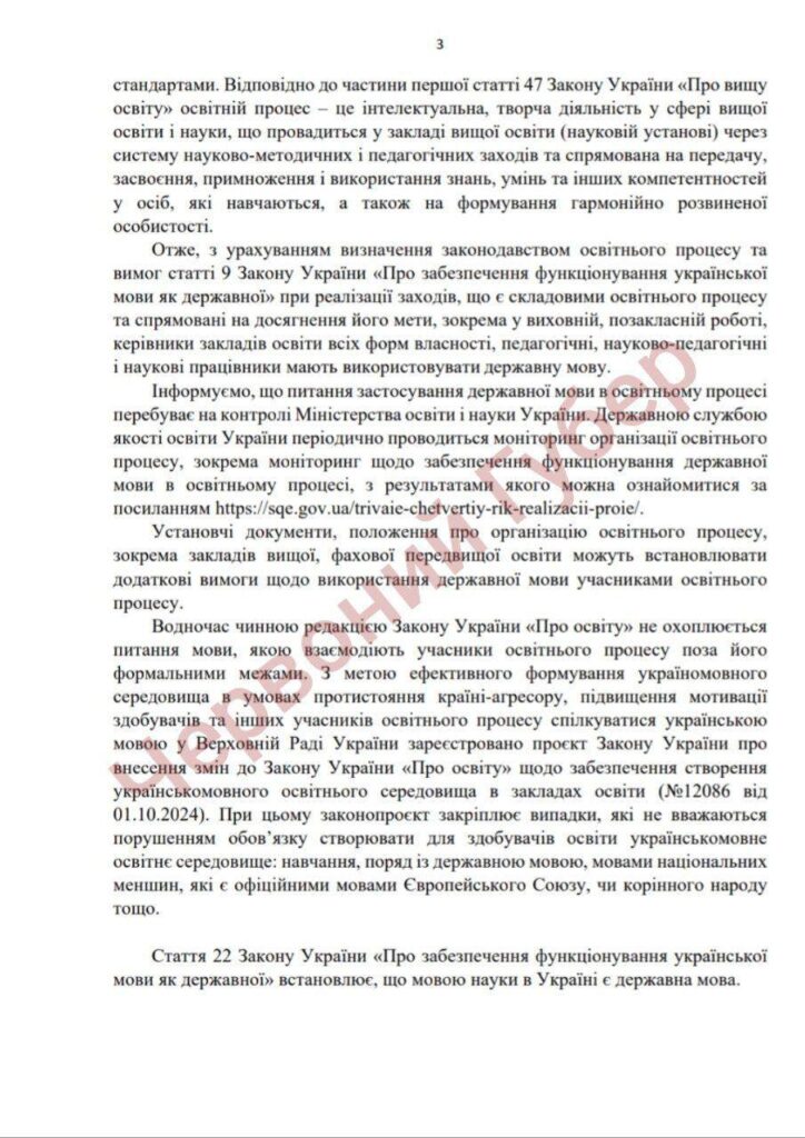 Согласно действующему законодательству, все руководители высших учебных заведений, педагоги, научно-педагогические и научные работники обязаны использовать украинский язык во время любых мероприятий, которые являются составляющими образовательного процесса.