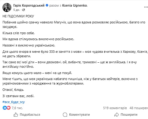 «Мы дома общаемся исключительно на русском. Снаружи я исключительно на украинском. Для этого вчера у меня было 333-е занятие по языку — моя замечательная учительница из Харькова, Ксения, не даст соврать. Так же все мои дети — они двуязычные. Ой, простите, трехъязычные — еще же английский. И я учу английский постоянно», — написал Корогодский.