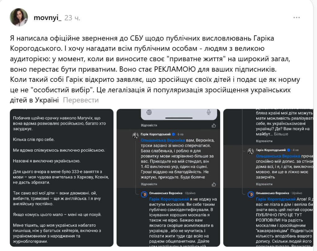 В своей заметке активистка написала, что публичное признание об использовании русского языка в семье, по ее мнению, является нормализацией и популяризацией русификации украинских детей. Она также сравнила такие заявления с публичным признанием поддержки связей с гражданами страны-агрессора.