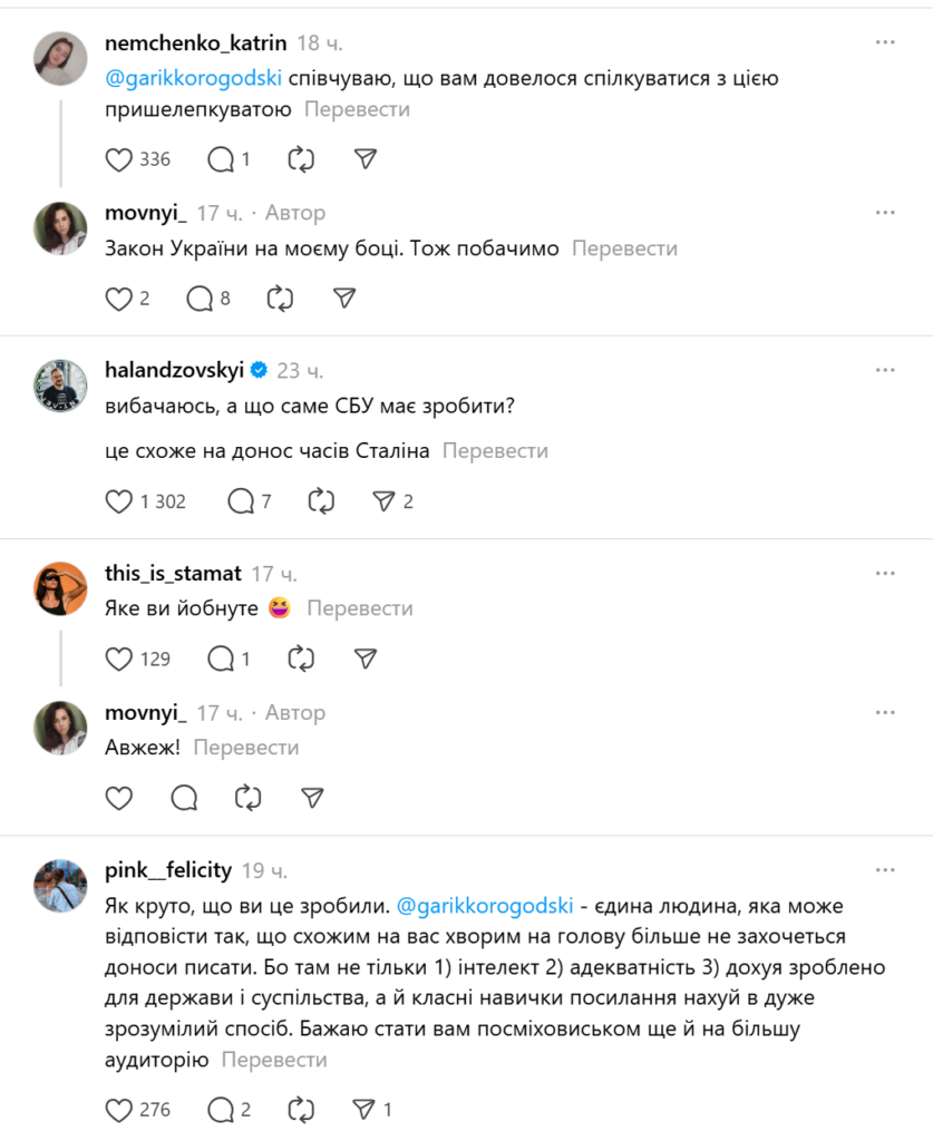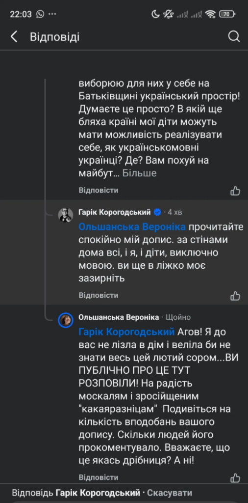 К своему сообщению активистка добавила скриншоты переписки в комментариях с Корогодским, где между ними возникла острая перепалка. На замечание Ольшанской бизнесмен ответил, что, по его мнению, ей «рано с ним спорить», и отметил, что делает для развития украинского языка значительно больше.