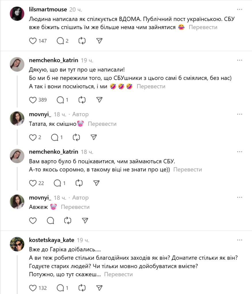 Ольшанская в ответах на комментарии продолжала отстаивать свою позицию и настаивала, что публичное озвучивание бытового использования русского языка имеет общественные последствия в условиях войны.