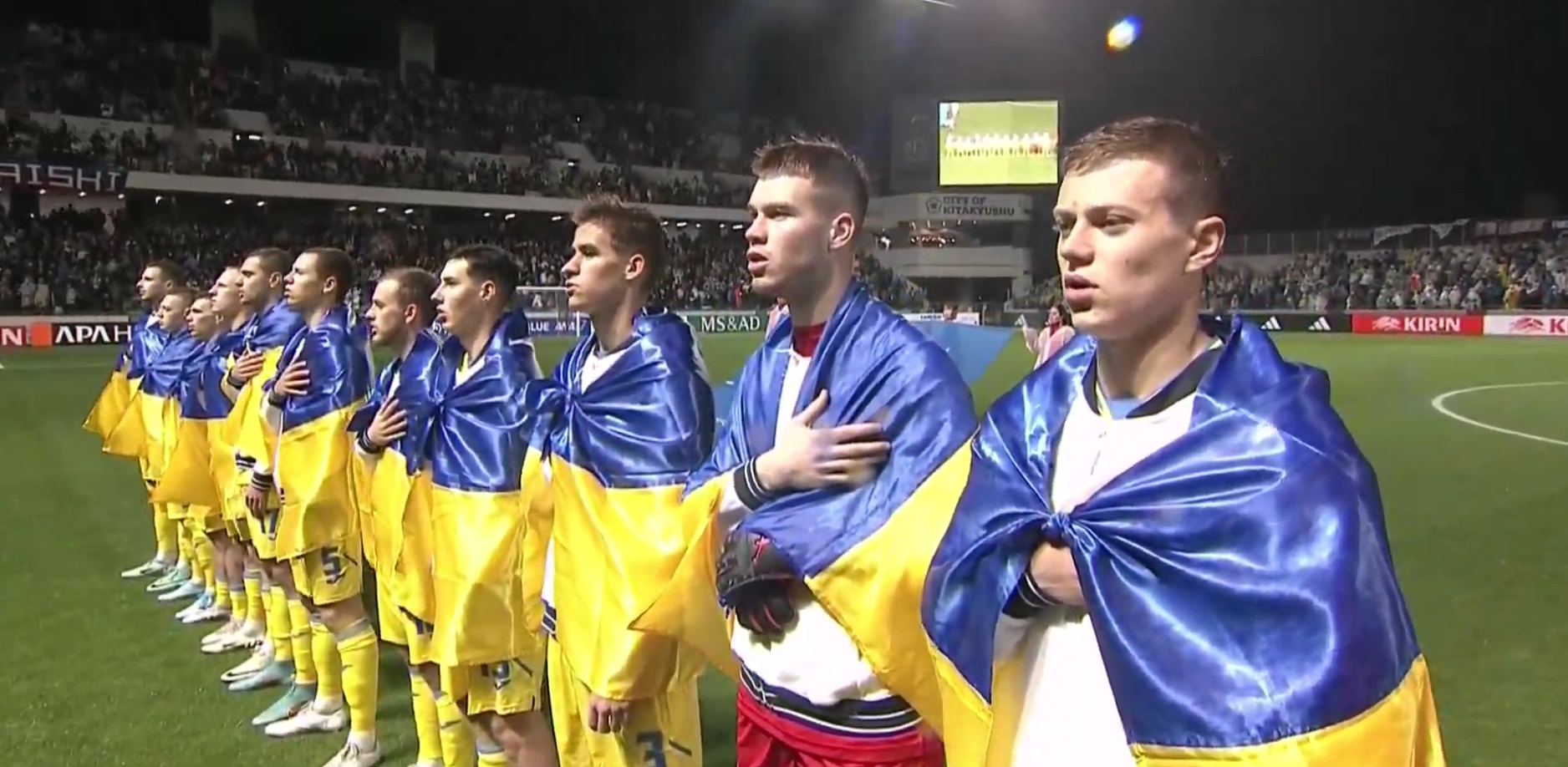 Свой первый поединок в истории сборная Украины U-23 провела в японском городе Фукуока на арене «Китакюсю Стэдиум». Это был товарищеский матч, в котором Украина проиграла со счетом 2:0. Голы забивали Кейн Сато (48 мин.) и Сатоши Танака (76 мин.).