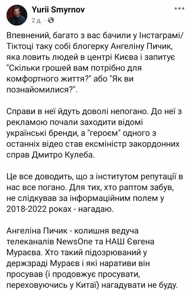 В то же время журналист отмечает, что это «свидетельствует о проблемах с институтом репутации в Украине». Он напоминает, что Ангелина Пичик ранее работала ведущей пророссийских телеканалов NewsOne и «Наш», которые принадлежали Евгению Мураеву — политику, подозреваемому в государственной измене, который сейчас скрывается в Китае.