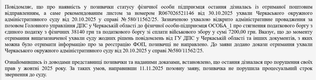 Отмечается, что до момента получения вышеупомянутого постановления суда никаких решений сообщений от ГУ ГНС в Черкасской области и других документов, из которых можно было получить информацию о регистрации ФЛП, истице не было направлено.