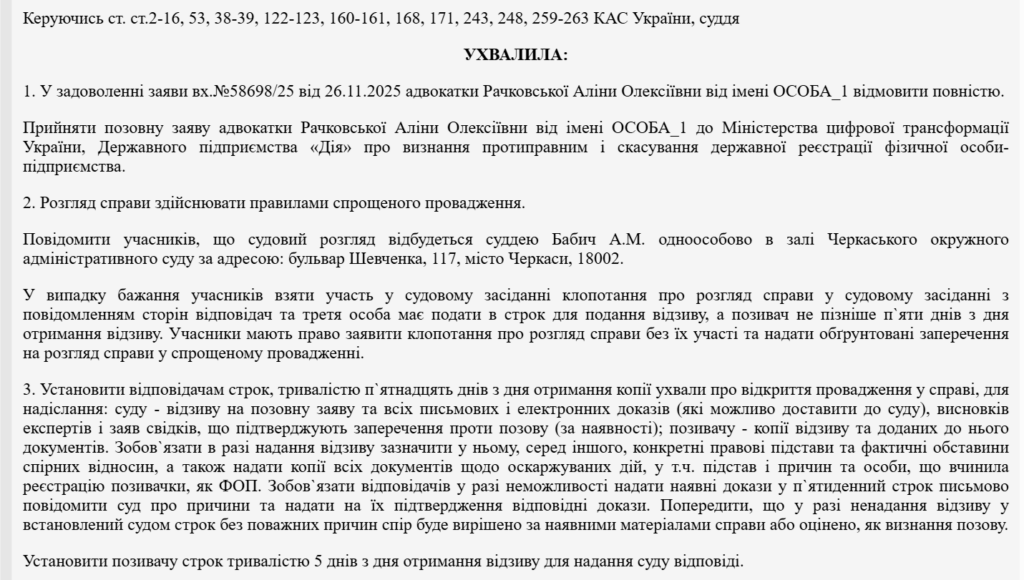 Суд решил рассматривать дело в упрощенном порядке без вызова сторон. Минцифры и ГП «Дія» обязаны в течение 15 дней подать отзыв, предоставить все документы, связанные с регистрацией ФЛП, а также объяснить, кто именно и на каких основаниях совершил соответствующие действия.