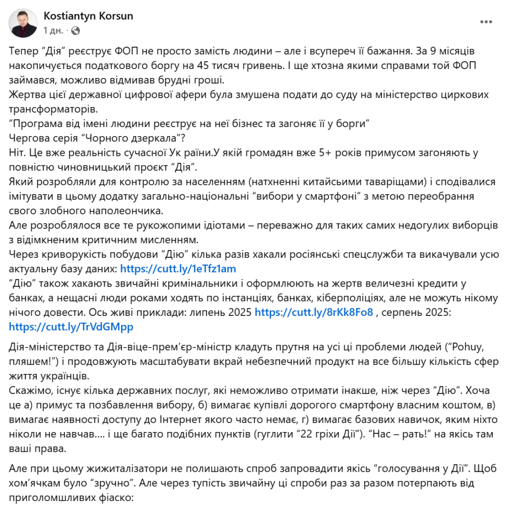 «Существует несколько государственных сервисов, которые невозможно получить иначе, чем через «Дію». Это фактически принуждение, которое требует смартфона, интернета и цифровых навыков, которым никто людей системно не обучал», — пишет Корсун.