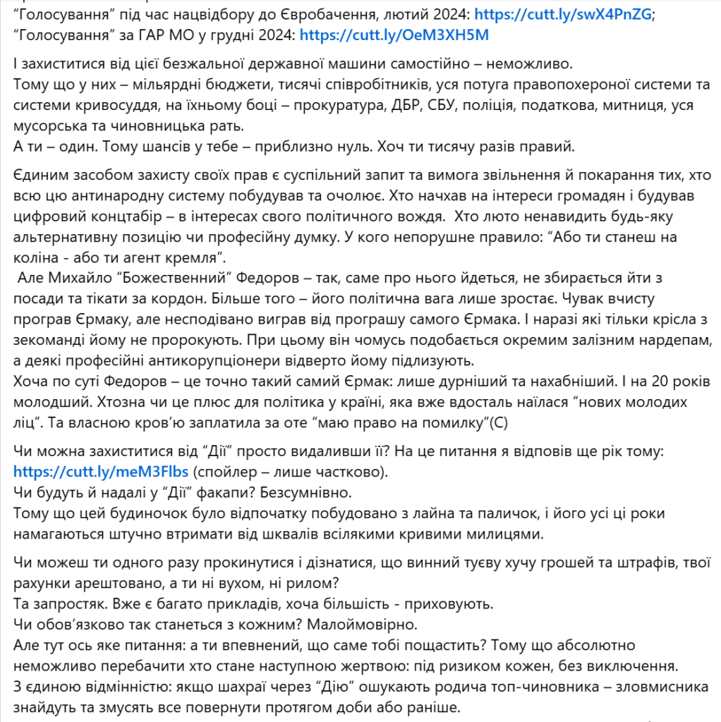 «»Дію» также хакают обычные уголовники и оформляют на жертв огромные кредиты в банках, а несчастные люди годами ходят по инстанциям, банкам, киберполиции, но не могут никому ничего доказать… Уже есть много примеров, хотя большинство — скрывают. Обязательно ли так произойдет с каждым? Маловероятно. Но тут вот какой вопрос: а ты уверен, что именно тебе повезет? Потому что совершенно невозможно предвидеть кто станет следующей жертвой: под риском каждый, без исключения» — отмечает он.