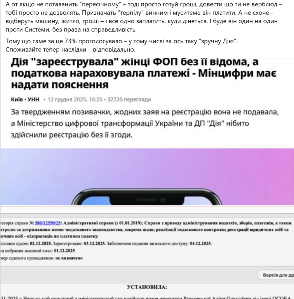 РАЗБОР ОТ В Украине набирает огласку история о якобы принудительной регистрации украинки как физического лица-предпринимателя через приложение «Дія» без ее согласия, в результате чего за несколько месяцев накопился значительный налоговый долг. Этот случай стал поводом для публичной дискуссии о безопасности цифровых государственных сервисов, в частности приложения «Дія», а также границ ответственности государства и пользователя.