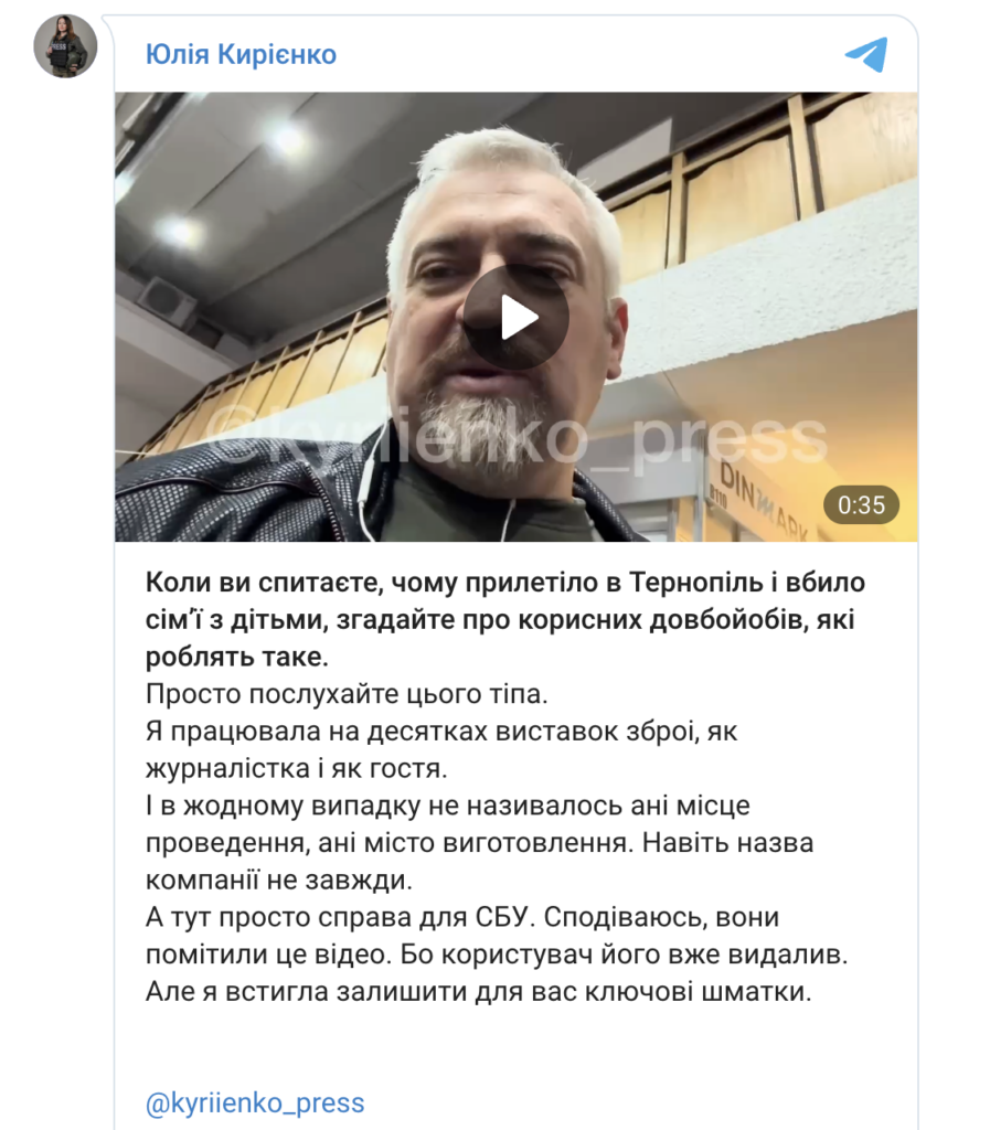 Совсем недавно похожий случай имел место в Тернополе, когда после обнародованного видео нардепом Александром Федиенко, Россия нанесла ракетный удар по заводу «Орион».