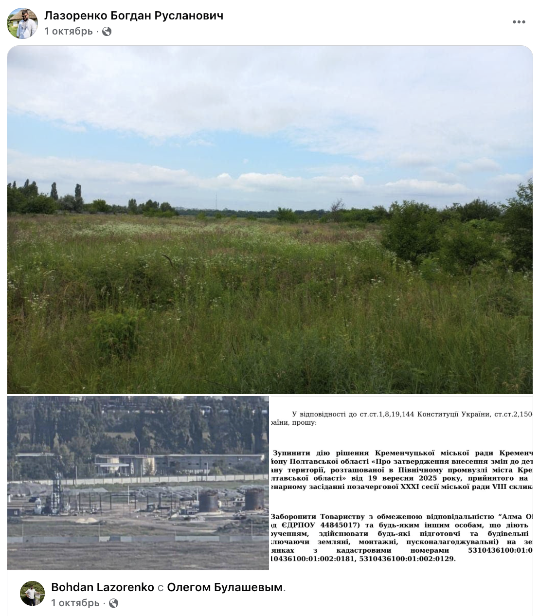 Своим сообщением в Фейсбук о заводе с фото объекта Лазоренко «делится» с редактором «Кременчугской газеты» Олегом Булашевым, которая, в свою очередь, посвятила заводу и «борьбе депутата Лазоренко за землю» более десятка публикаций. И именно на страницах «Кременчугской газеты» в свое время были опубликованы документы из решений горсовета, а именно Детальный план территории расположения будущего нефтеперерабатывающего предприятия.