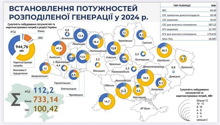 «За прошедший 2024-й год, бизнес и территориальные общины построили 982 мегаватта, то есть почти 1 гигаватт в распределенной генерации. 587 мегаватт занимают солнечные станции, которые построены на крышах. Это делают крупные торговые центры, сети супермаркетов, логистические терминалы», — констатирует специалист.