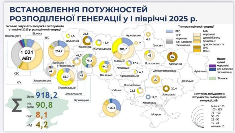 Еще 1 гигаватт распределенной генерации, по подсчетам Станислава Игнатьева, появился в Украине в течение первого полугодия 2025 года. Как отмечается в подготовленном им исследовании, за первые шесть месяцев года: