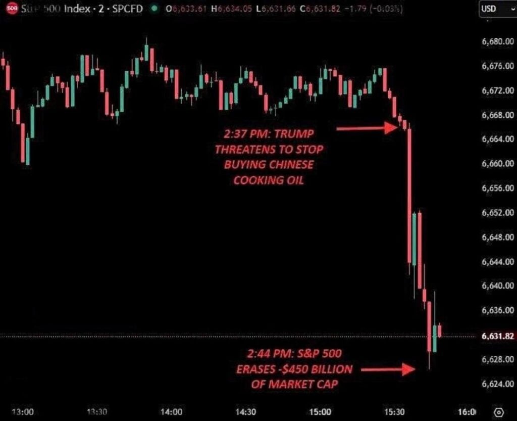 Президент США Дональд Трамп на своей странице в Truth Social пригрозил не покупать растительное масло в Китае, а производить его в США. Заявление Трампа привело к обвалу фондового рынка США, сообщает «Коммерсант Украинский»
