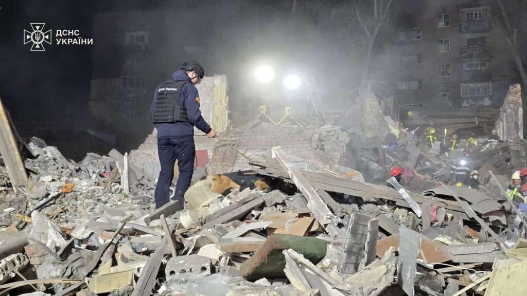 Среди обломков разрушенного российской ракетой дома в Киеве до сих пор слышны телефонные звонки. Спасатели не останавливают поисковые работы — под завалами могут быть люди. Министр внутренних дел Игорь Клименко сообщил, что ищут по меньшей мере двух детей, информирует «Коммерсант Украинский»