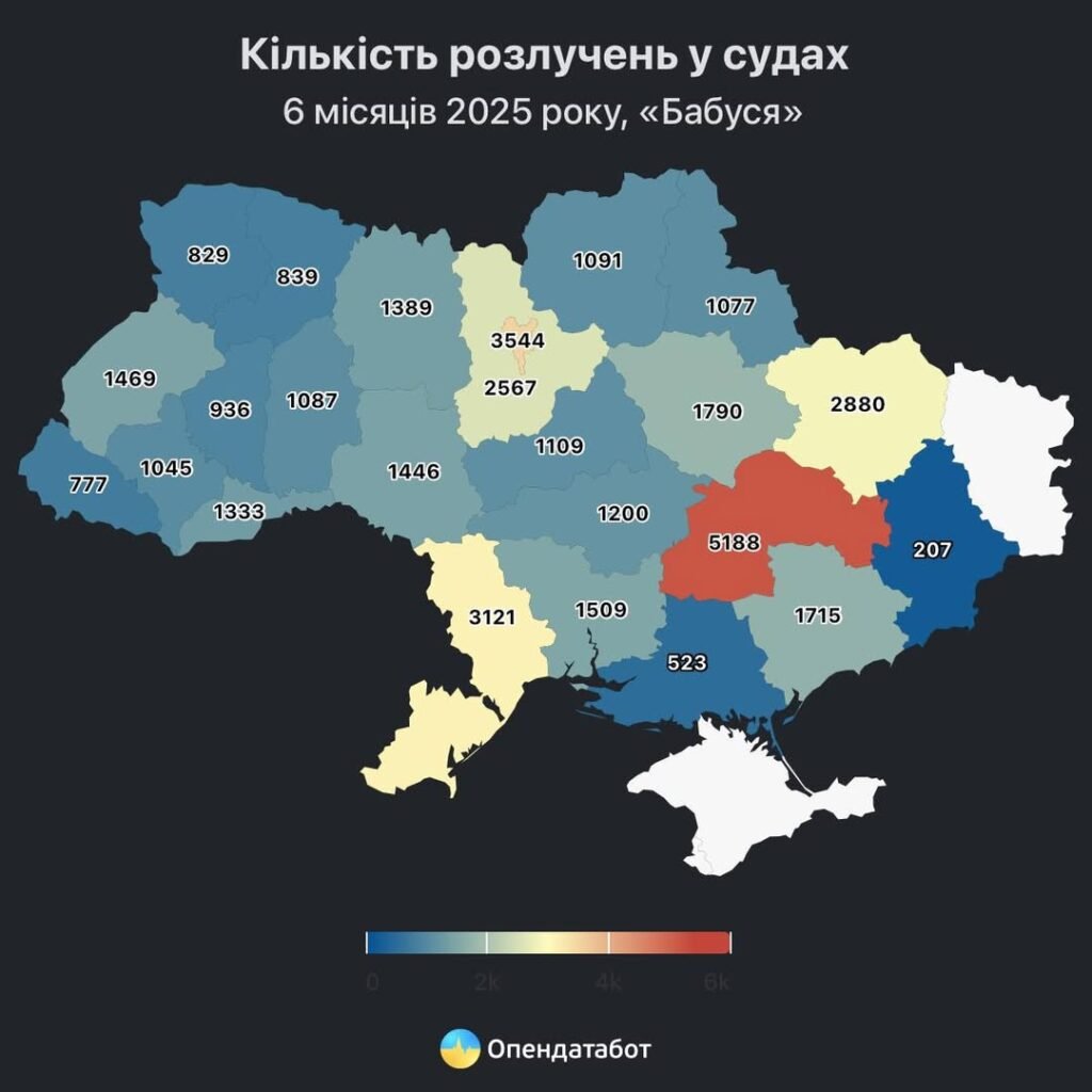 Ранее Opendatabot сообщил, что в первой половине этого года суды Украины оформили более 38,7 тыс. разводов, что втрое превышает показатель в ЗАГСах (12,7 тыс.).