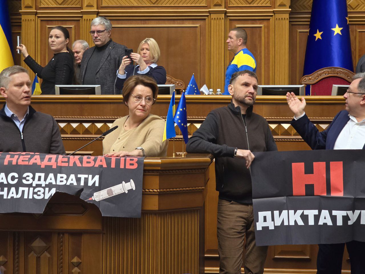 Так, сначала народные депутаты поднялись на трибуну Рады с плакатами «Украина — не россия», «Нет диктатуре», «ДумайТЕ о победе, а не о выборах», а потом выкрикивали «Позор!» и «Нет политическим репрессиям».