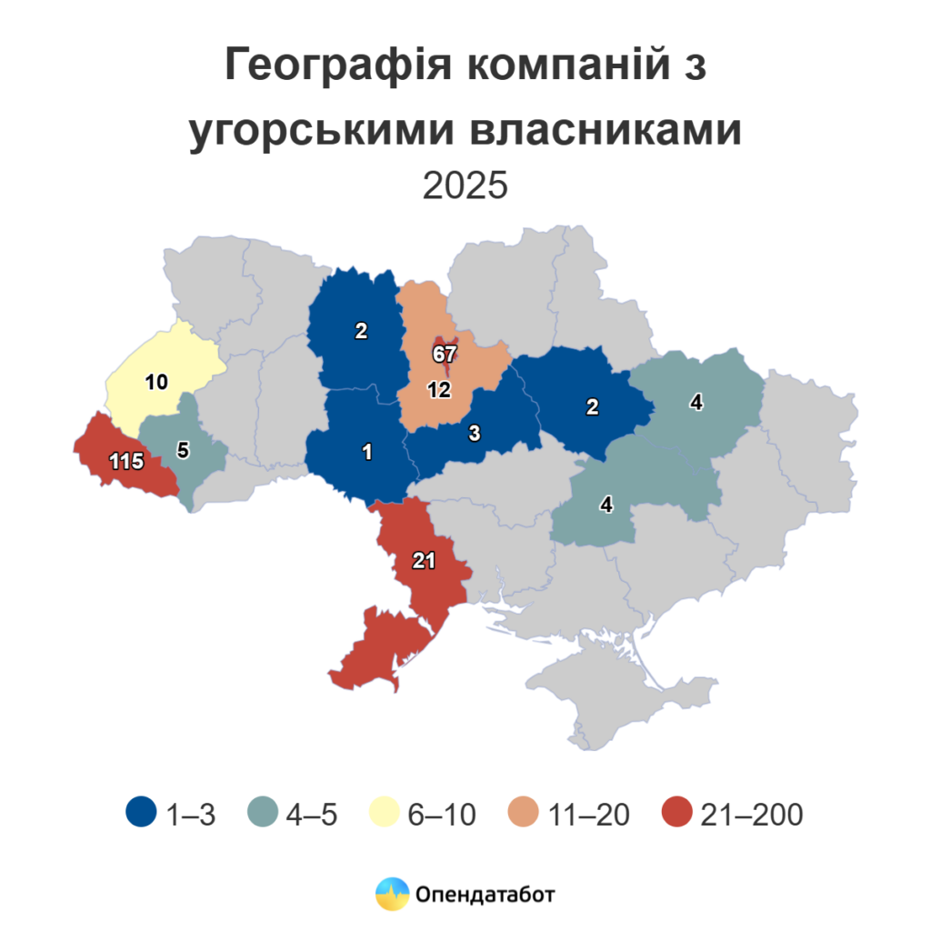 Данные OpenDataBot свидетельствуют, что венгерский бизнес в Украине остается заметным, но очень неравномерно распределенным. По количеству компаний лидирует Закарпатье, что логично из-за географической близости к Венгрии и исторических связей региона.