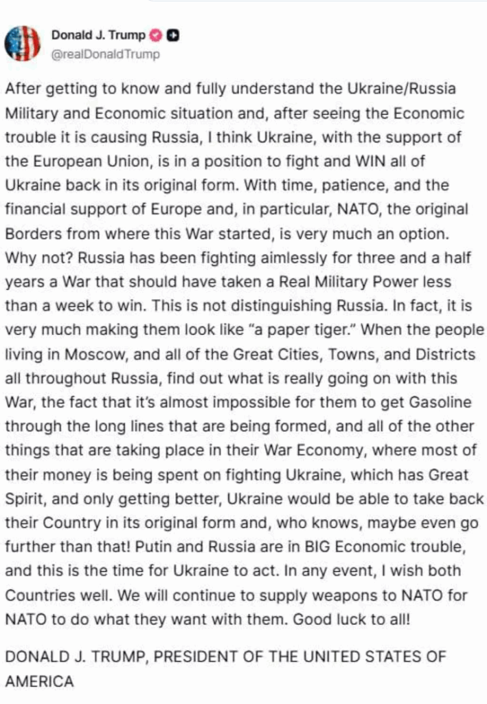 «После того, как я узнал и полностью понял военно-экономическую ситуацию Украины/россии, и увидев экономические проблемы, которые это вызывает россии, я думаю, что Украина, при поддержке Европейского Союза, способна бороться и вернуть всю Украину в ее первоначальном виде. Со временем, терпением и финансовой поддержкой Европы, и, в частности, НАТО, возвращение к начальным границам, с которых началась эта война, вполне возможно. Почему бы и нет?», — отметил Трамп.