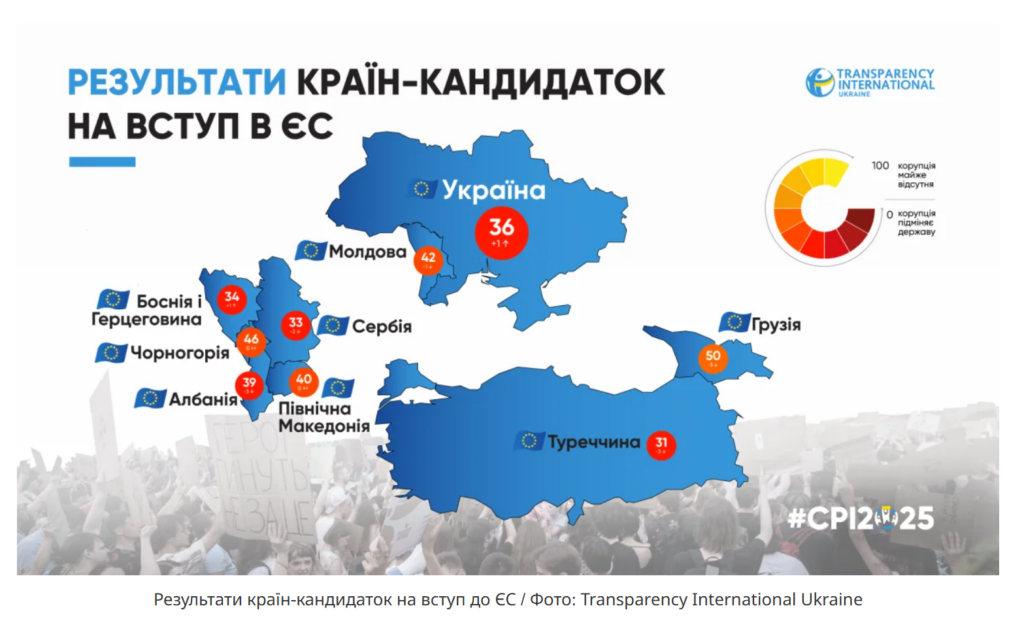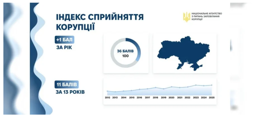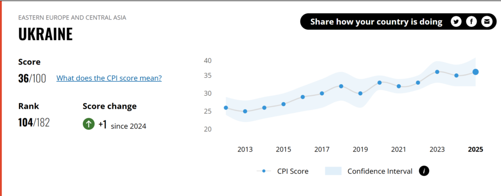 Украина улучшила результат в Индексе восприятия коррупции (Corruption Perceptions Index, CPI) по итогам 2025 года: страна получила 36 баллов из 100 и заняла 104-е место среди 182 государств. Это на 1 балл больше, чем в прошлом году, и свидетельствует об умеренном прогрессе на фоне полномасштабной войны и высоких рисков для публичного сектора. Об этом говорится на сайте Transparency International Ukraine, сообщает «Коммерсант Украинский»