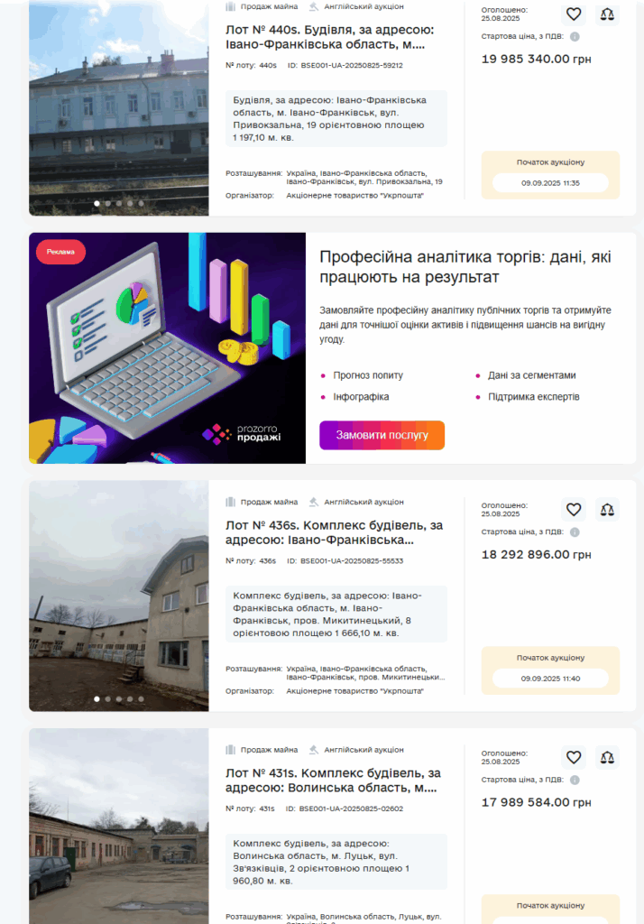 Среди самых дорогих лотов стоит отметить и объекты в Ивано-Франковске и в Волынской области: здание на Привокзальной оценили почти в 20 млн грн, комплекс в Никитинецком переулке — в 18,3 млн грн и комплекс зданий в Луцке — почти в 18 млн грн.