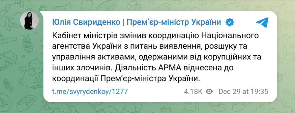 «Кабинет министров изменил координацию Национального агентства Украины по вопросам выявления, розыска и управления активами, полученными от коррупционных и других преступлений. Деятельность АРМА отнесена к координации Премьер-министра Украины», — сообщила Юлия Свириденко.