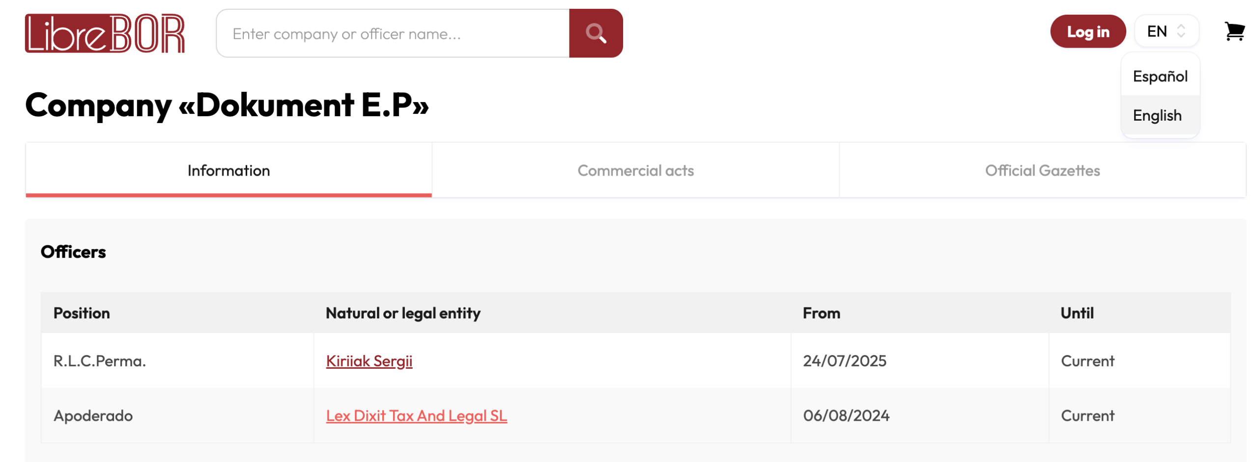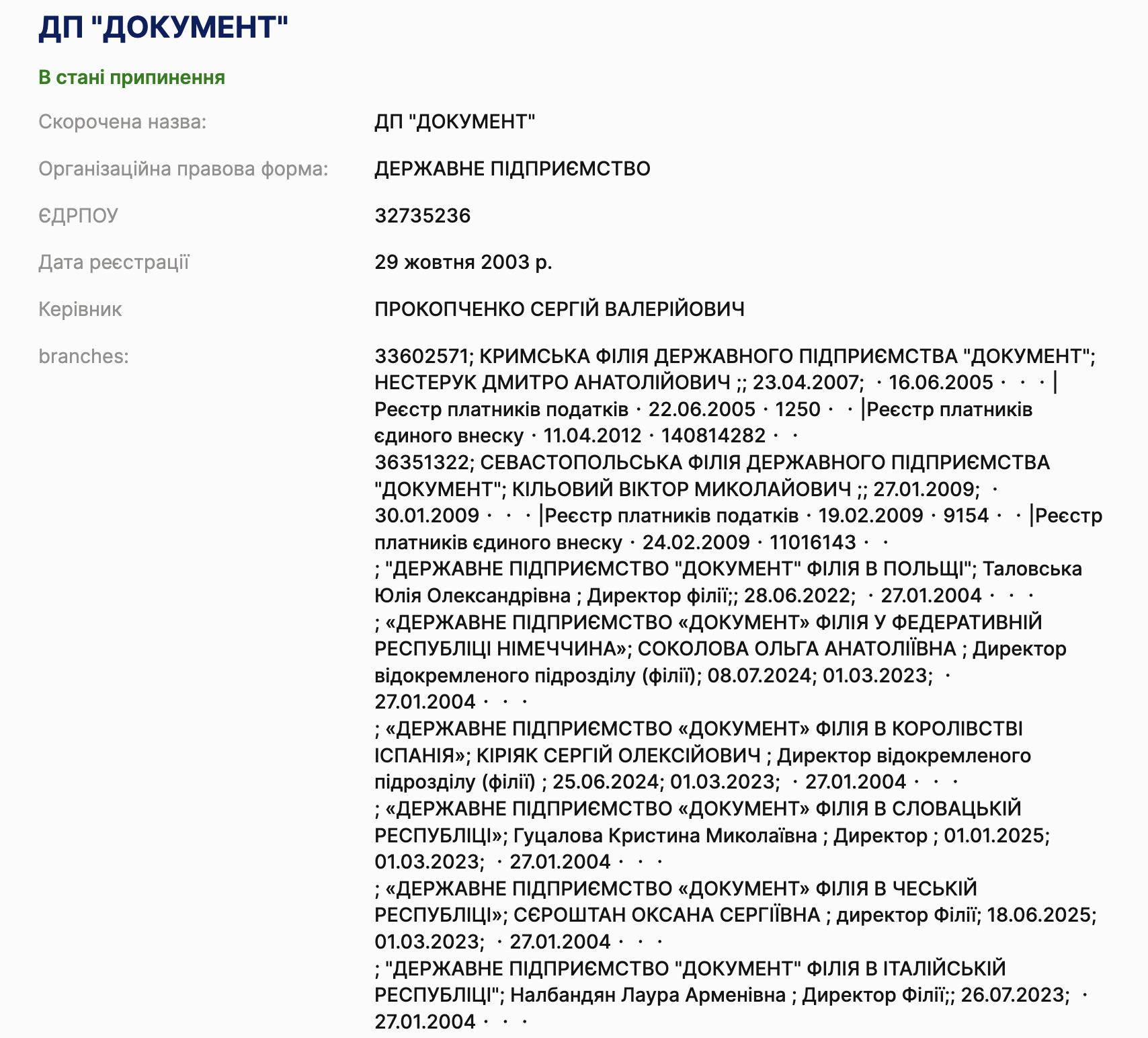 Постоянным представителем филиала Государственного предприятия «Документ» в Испании является КИРИЯК СЕРГЕЙ АЛЕКСЕЕВИЧ, что подтверждают и украинские реестры.