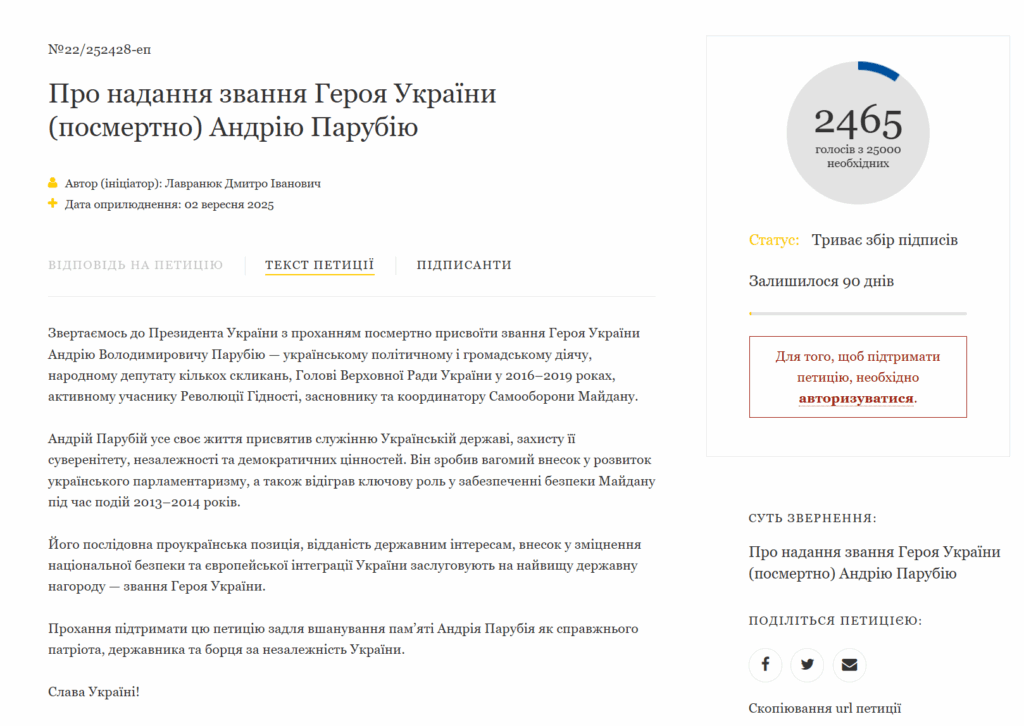 «Андрей Парубий всю свою жизнь посвятил служению Украинскому государству, защите его суверенитета, независимости и демократических ценностей. Он сделал весомый вклад в развитие украинского парламентаризма и сыграл ключевую роль в обеспечении безопасности Майдана во время событий 2013-2014 годов», — говорится в петиции.