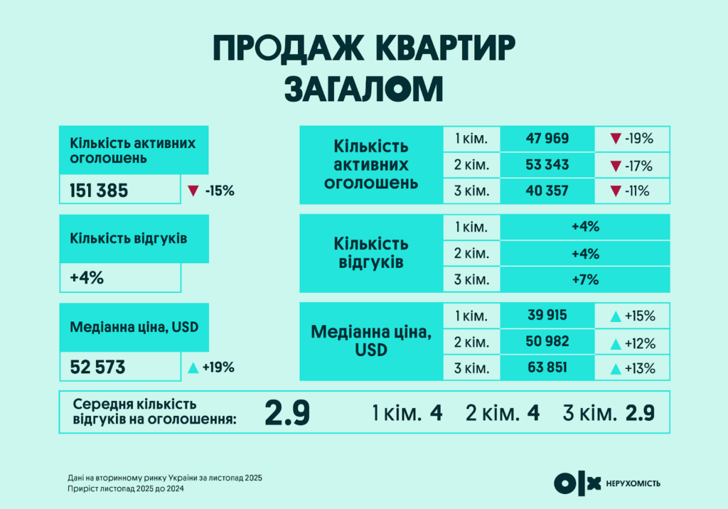 Попит на купівлю квартир за рік зріс на 4%, але пропозиція скоротилася одразу на 15%. У результаті медіанна ціна по країні підскочила на 19%. Найдорожчими залишаються Київ і великі міста заходу — Львів, Івано-Франківськ, Ужгород. Саме Ужгород став рекордсменом за темпами зростання — плюс 60% за рік.