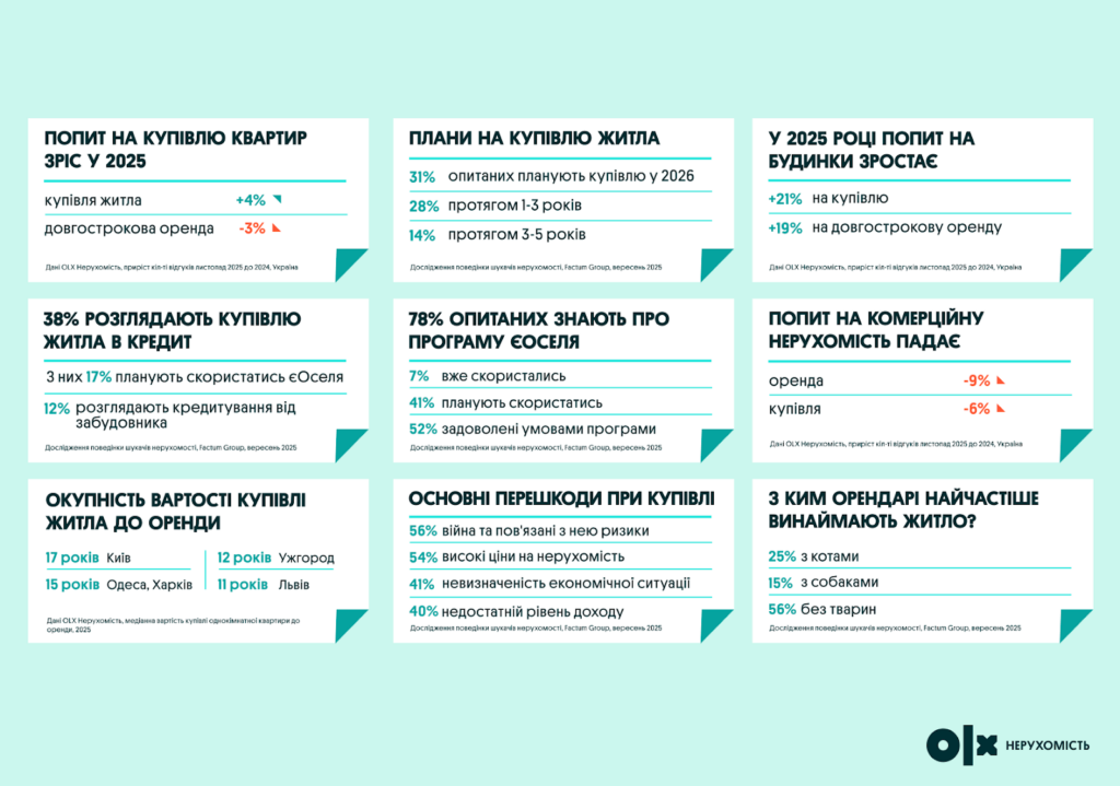 У 2025 році український ринок нерухомості продовжив адаптацію до умов війни, енергетичних ризиків і обмеженої пропозиції. Дані OLX Нерухомість показують: попит у низці сегментів зростав, тоді як кількість пропозицій скорочувалася, що майже всюди трансформувалося у підвищення цін, передає «Комерсант Український».