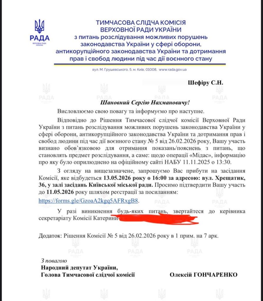 Колишнього першого помічника президента Володимира Зеленського Сергія Шефіра викликають на засідання Тимчасової слідчої комісії Верховної Ради через нові розшифровки розмов у межах операції НАБУ «Мідас». Про це повідомив Голова ТСК, народний депутат Олексій Гончаренко у своєму Telegram-каналі, інформує «Комерсант Український»