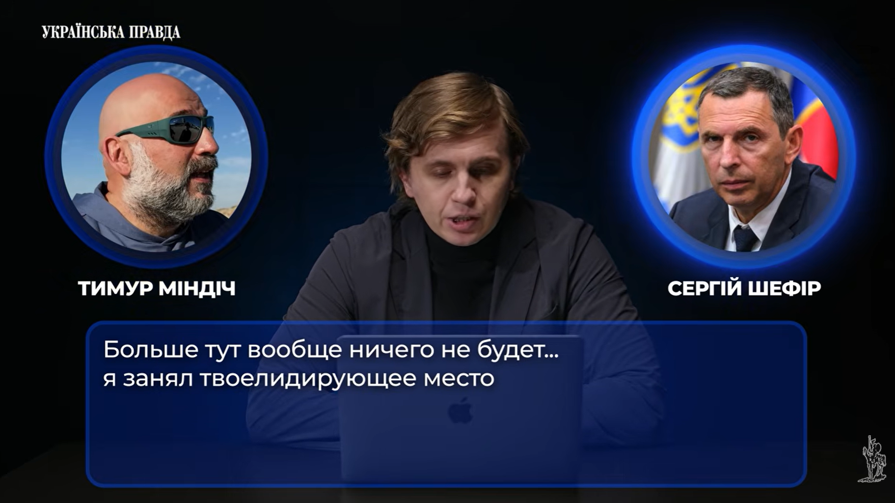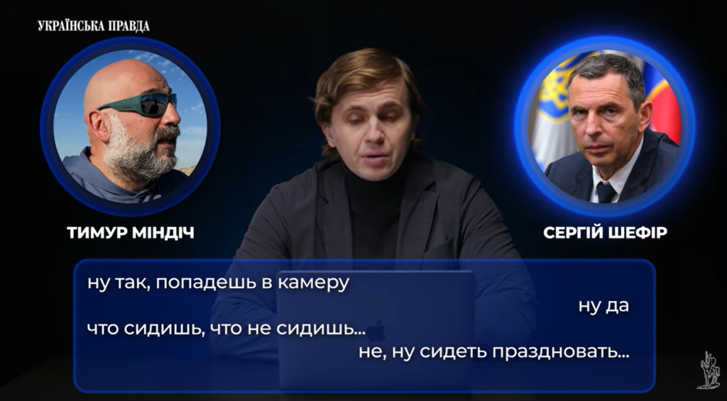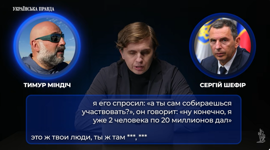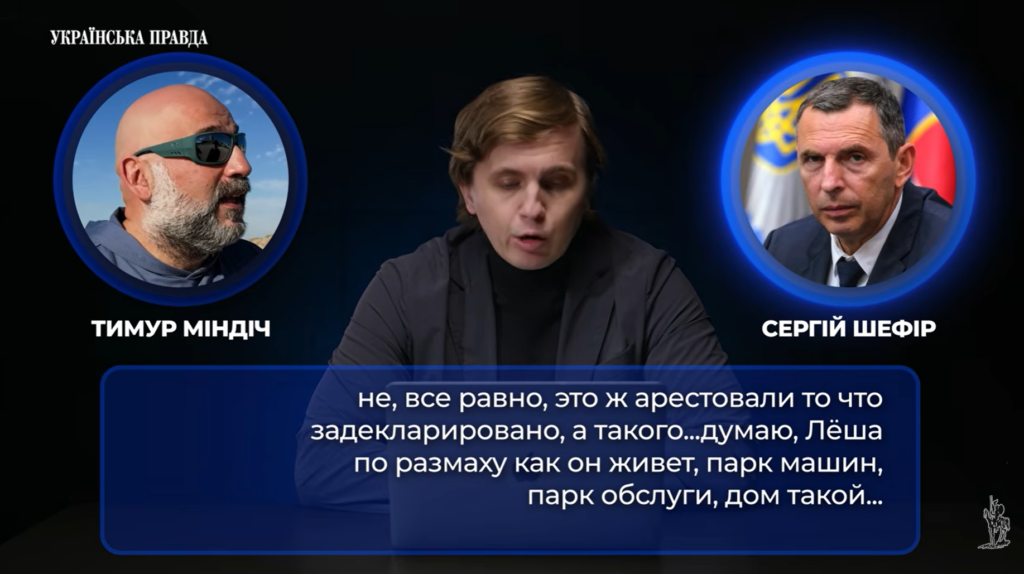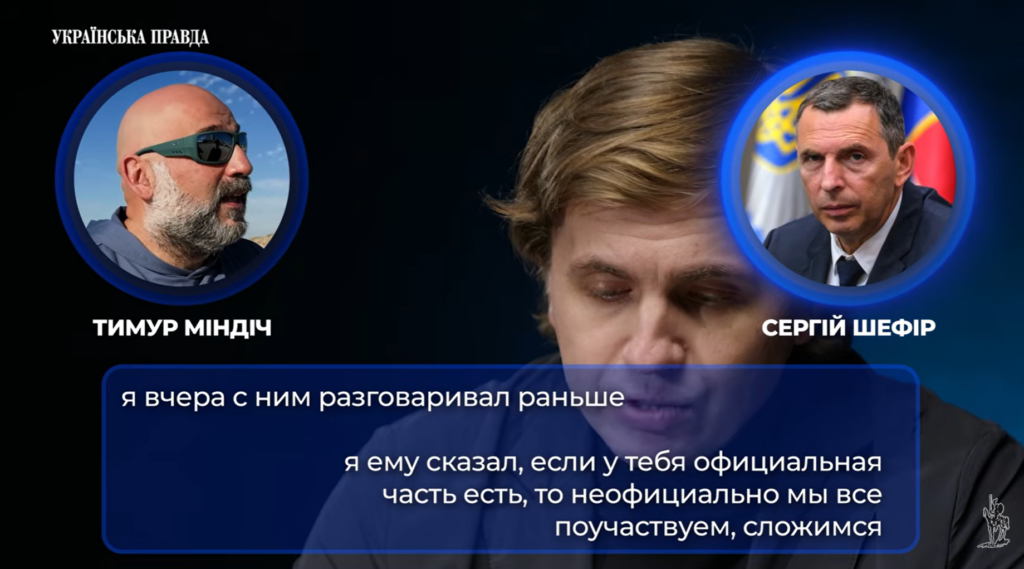Один із головних епізодів нових розшифровок стосується розмови, де, за даними УП, спілкуються Тимур Міндіч і Сергій Шефір. У ній співрозмовники нібито обговорюють певного «Льошу», якому потрібно зібрати кошти — частково «офіційно», частково «неофіційно».