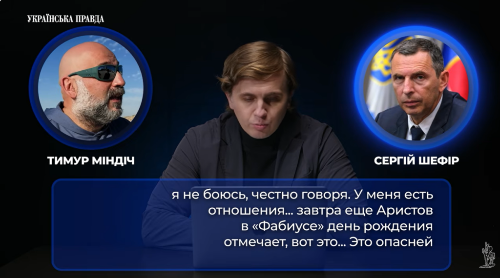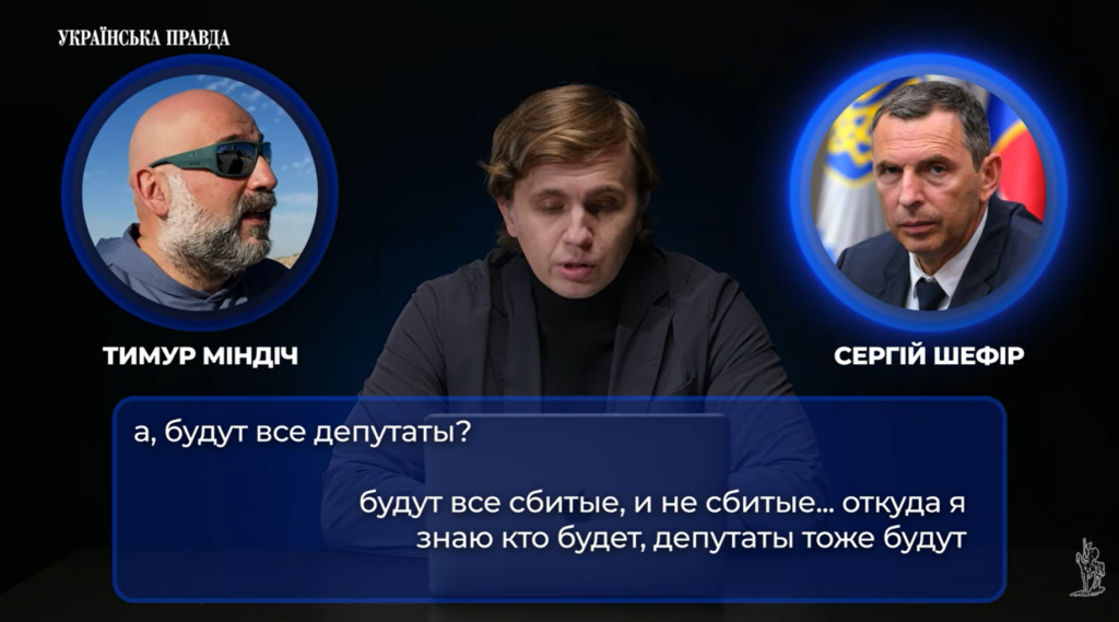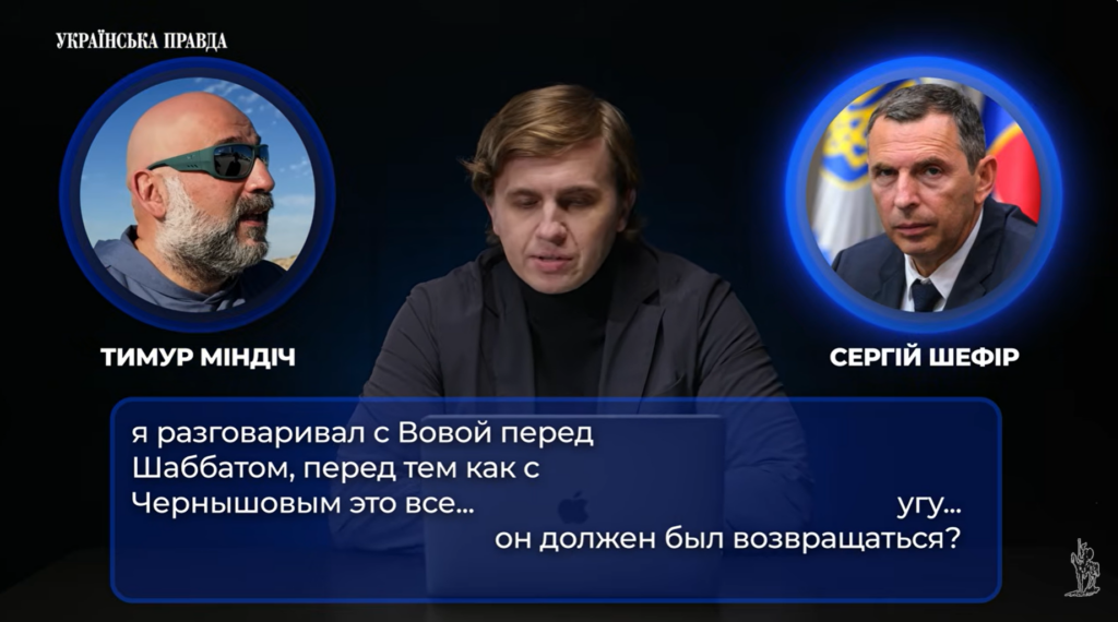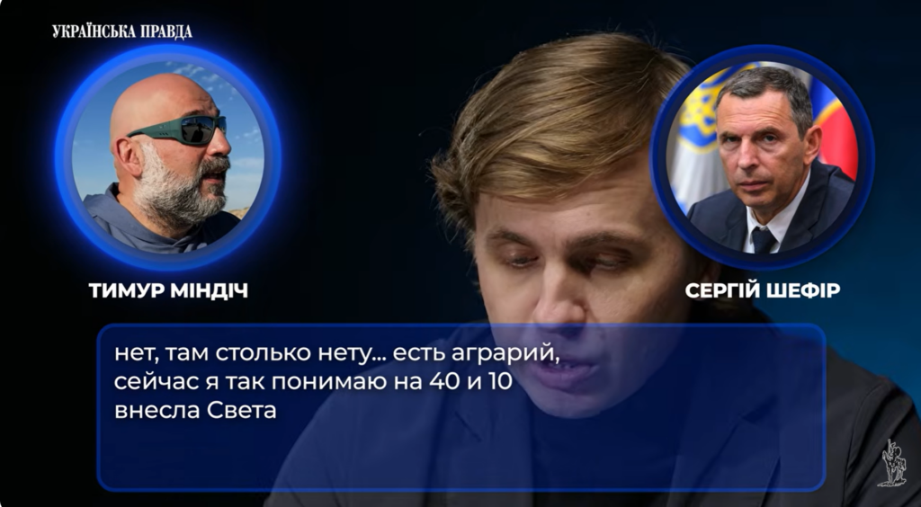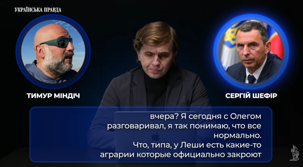 Один із головних епізодів нових розшифровок стосується розмови, де, за даними УП, спілкуються Тимур Міндіч і Сергій Шефір. У ній співрозмовники нібито обговорюють певного «Льошу», якому потрібно зібрати кошти — частково «офіційно», частково «неофіційно».