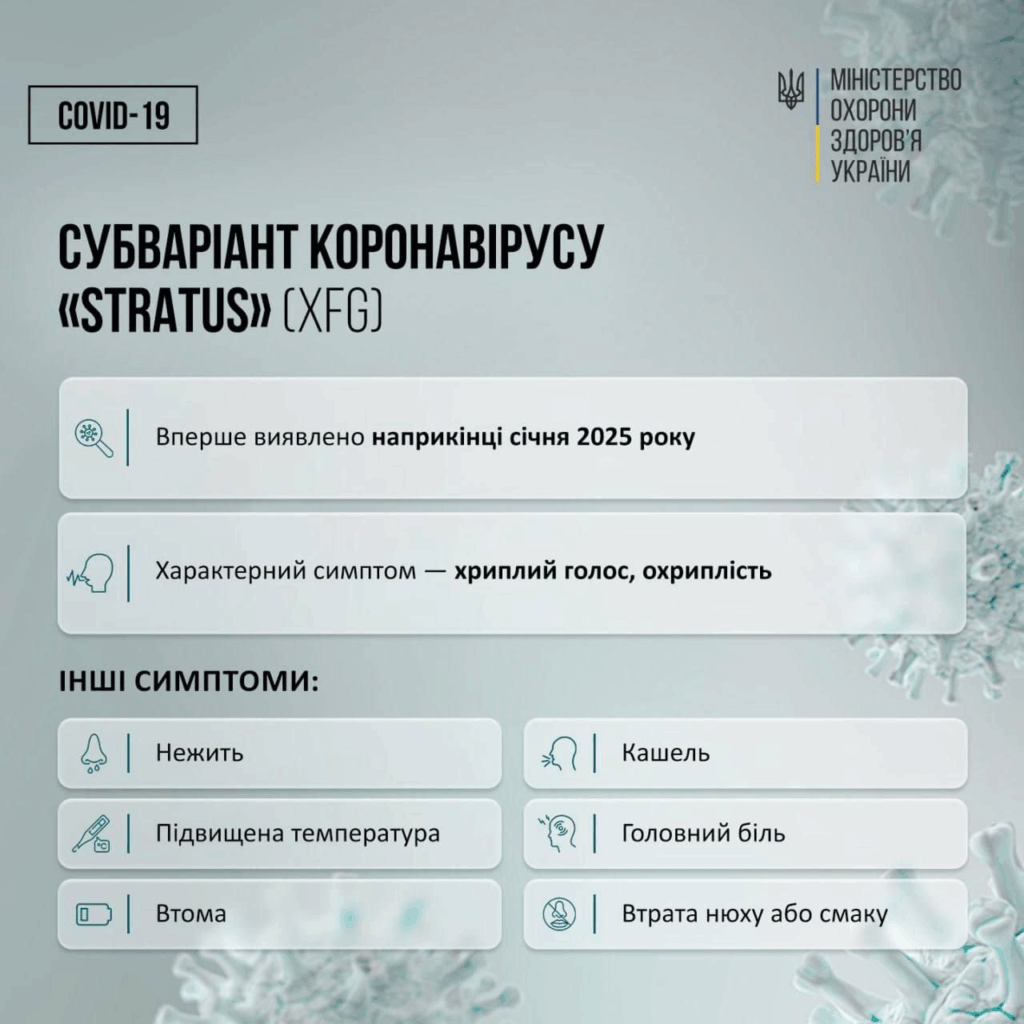 Симптоми Stratus схожі з попередніми варіантами коронавірусу. Це кашель, нежить, втома, підвищення температури, біль у горлі. Характерна ознака — охриплість голосу.