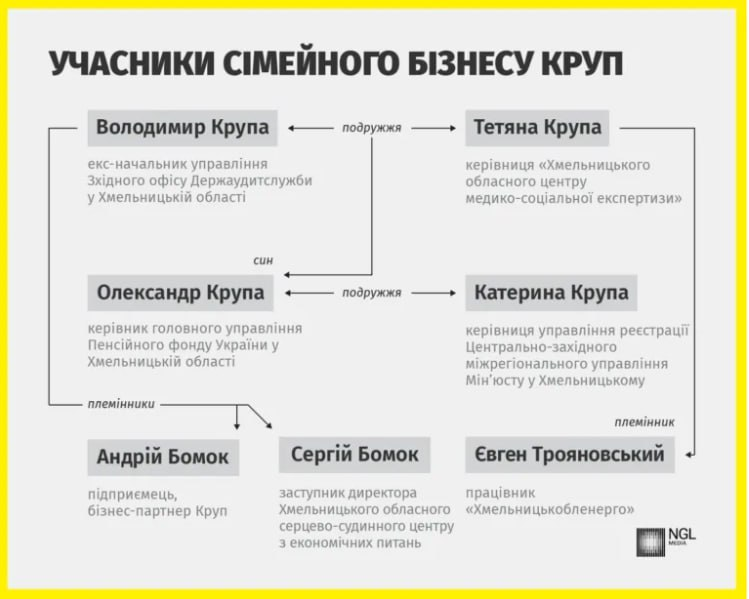 Тетяна та Олександр Крупа, за версією слідства, заробляли на “ухилянтах” та відмивали гроші через різні бізнес-проєкти. Щобільше, майже всі прокурори Хмельницької області виявились інвалідами 2 групи згідно з рішенням головного лікаря МСЕК Тетяни Крупи. Вони багато років отримували від держави пенсії за інвалідність — згідно з рішеннями начальника Пенсійного фонду Олександра Крупи.