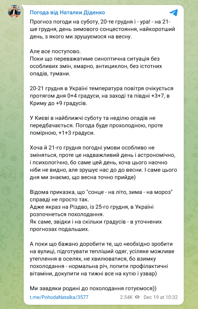 «Якраз на Різдво, із 25 грудня, в Україні розпочнеться похолодання», — написала вона на своїй сторінці у Telegram.