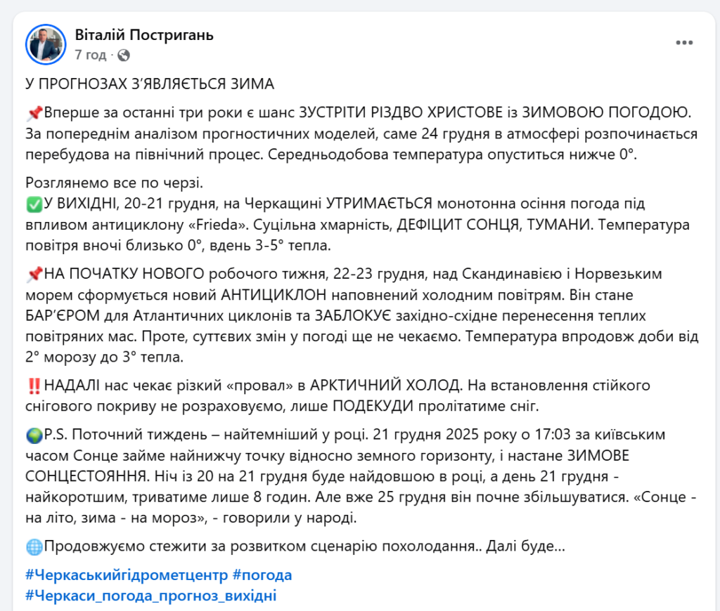 «Вперше за останні три роки є шанс зустріти Різдво Христове із зимовою погодою», — зазначив він у Facebook.