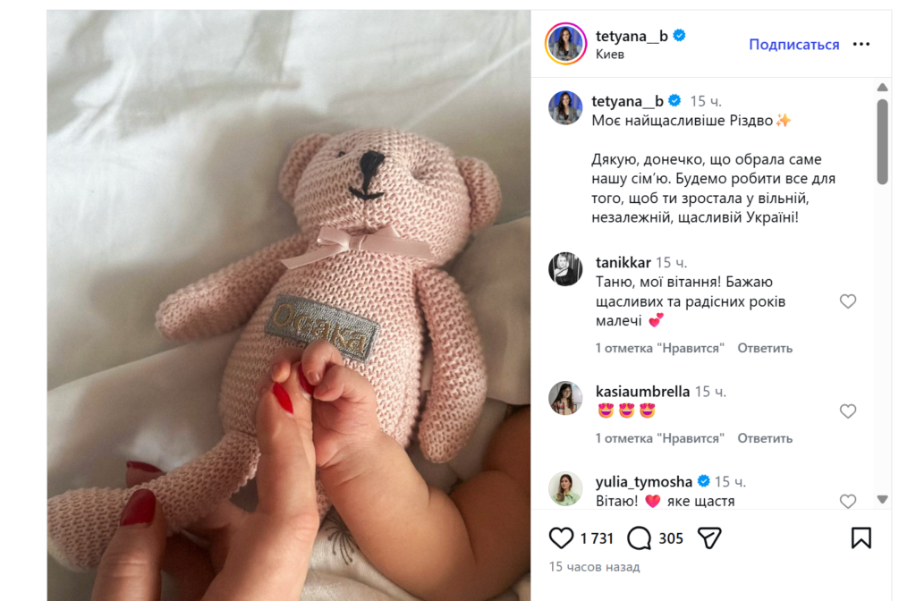 «Дякую, донечко, що обрала саме нашу сімʼю. Будемо робити все для того, щоб ти зростала у вільній, незалежній, щасливій Україні!» — написала вона.