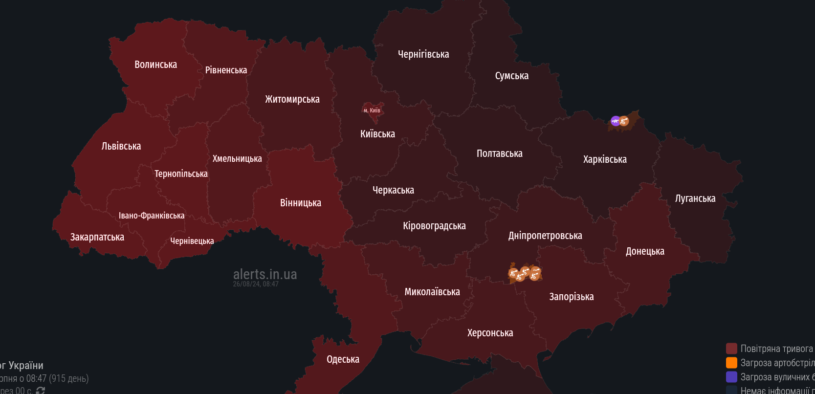Вранці понеділка, 26 серпня, триває масштабна повітряна атака росіян на українські міста, яка розпочалася близько першої години ночі, повідомляє «Комерсант Український» з посиланням на повідомлення Збройних Сил та військових адміністрацій.