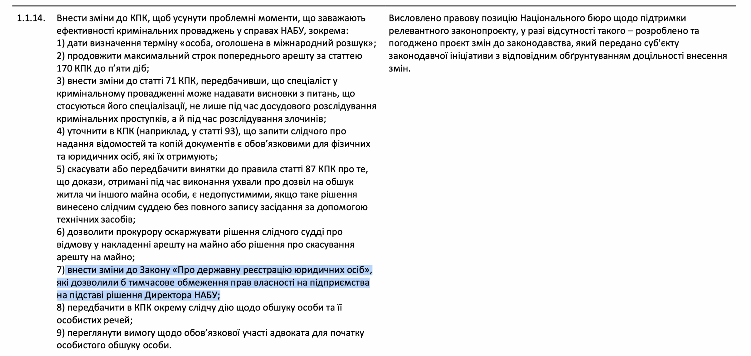 Нагадаємо, у документі під назвою “План заходів з реалізації стратегії розвитку НАБУ”, який опубліковано на сайті бюро, йдеться про ініціативу внести зміни до Кримінального процесуального кодексу та Закону “Про державну реєстрацію юридичних осіб”, які б дозволити тимчасове обмеження прав власності на підприємства за рішенням директора НАБУ.