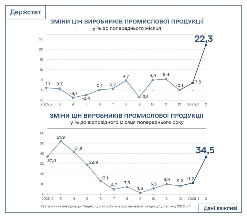 Різке зростання індексу цін виробників у лютому 2026 року може спричинити подорожчання товарів у магазинах уже найближчими місяцями та хвилю закриття малого бізнесу. Такий прогноз в Facebook озвучив підприємець Олег Белінський, коментуючи нові дані Державної служби статистики, передає «Комерсант Український»