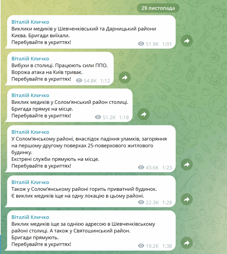 У ніч на 29 листопада 2025 року Київ зазнав чергової масштабної ворожої атаки. Російські агресори влаштували комбіновані удари на кілька районів столиці. Є пошкодження житлової багатоповерхівки, у 6 локаціях Києва є наслідки ворожої атаки. Про це повідомили начальник Київської міської військової адміністрації Тимур Ткаченко та міський голова Києва Віталій Кличко.