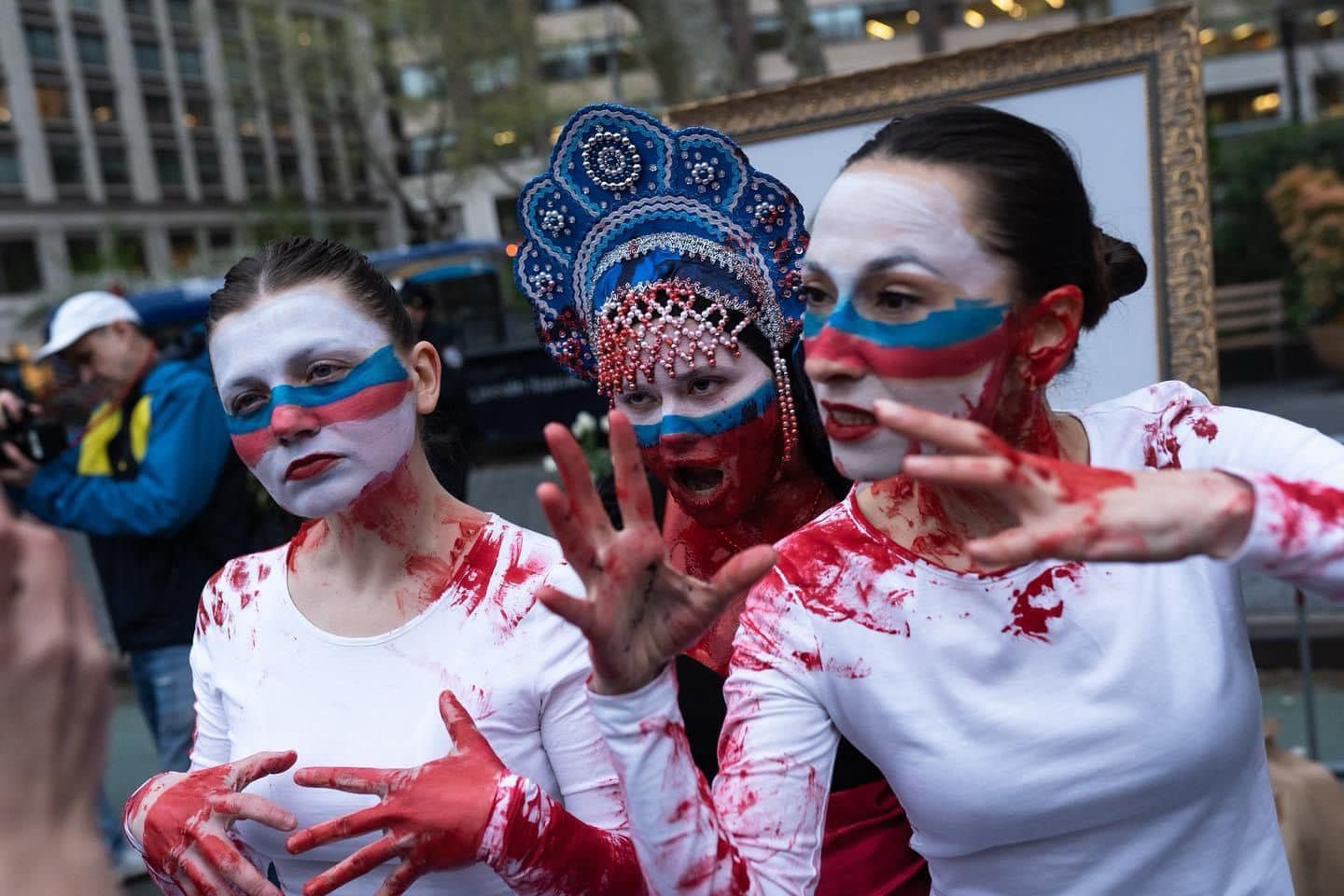 Протест української діаспори пройшов 19 квітня у вигляді перфомансу. Українки прийшли одягнені в закривавлені балетні пачки.
