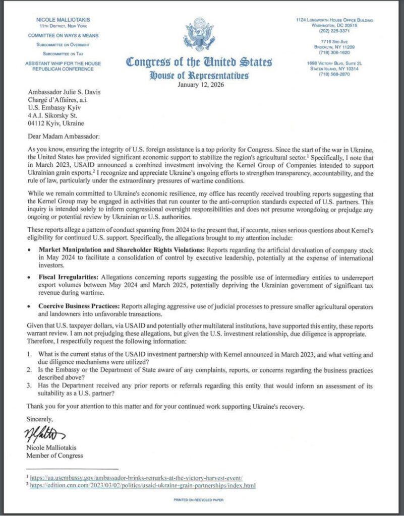 «Kernel group може займатися діяльністю, що суперечить антикорупційним стандартам, які очікуються від партнерів США», – із таким застереженням до Тимчасової повіреної у справах США Джулі Девіс звернулася конгресвумен від Республіканської партії Ніколь Малліотакіс.