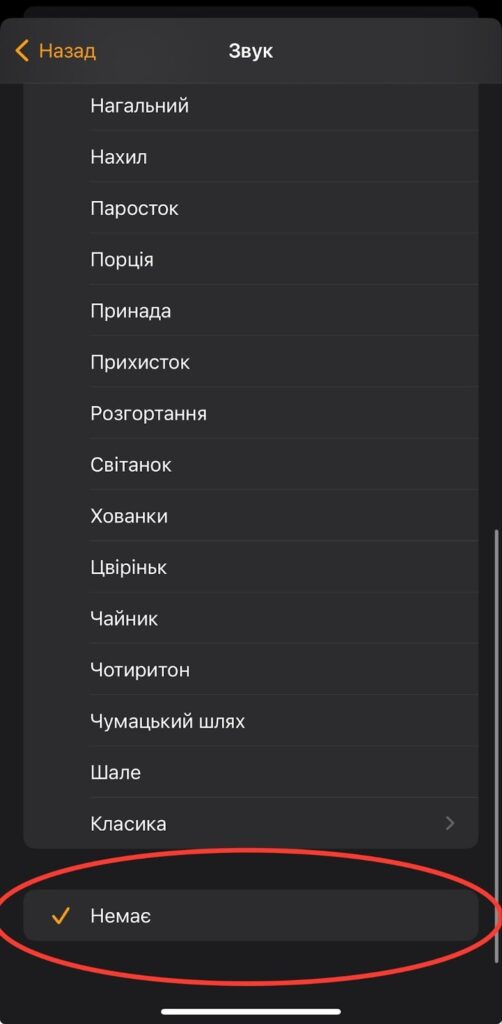 - Зайдіть у “Звук” і переконайтеся, що вибрана саме мелодія, а не “Немає/None”.