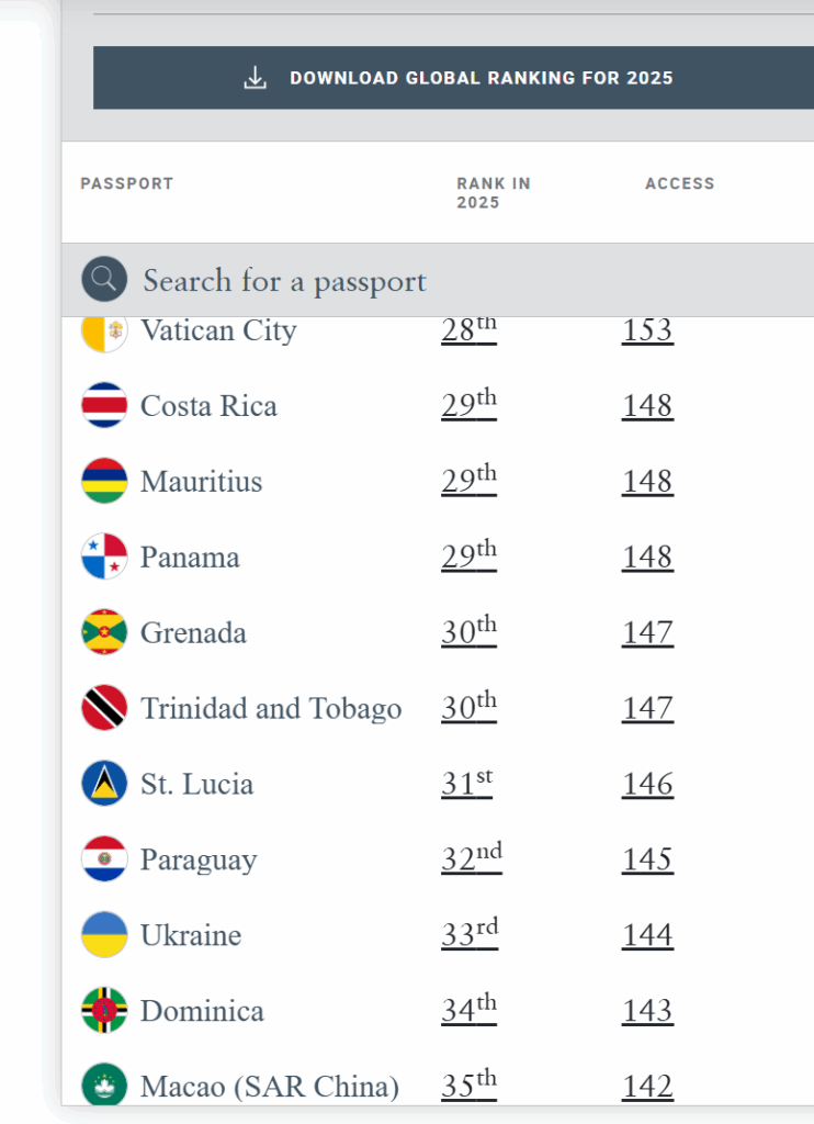 Паспорт громадянина України у 2025 році втратив одну позицію у світовому рейтингу The Henley Passport Index, який визначає рівень глобальної мобільності громадян різних країн світу, повідомляє «Комерсант Український»